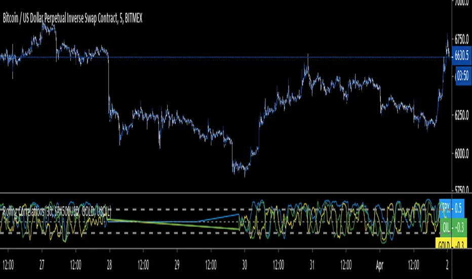 This script calculates rolling correlations for up to 3 different assets at a time, compared to the main asset that is on the screen. Right now, it's best set up to use with Bitcoin and traditional assets. Created due to the recent high correlations.