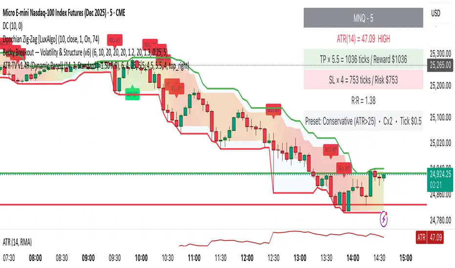 If ATR jumps above 25, it automatically warns you and, if conservative mode is on, switches to tighter settings (like TP × 5.5 / SL × 4.0).