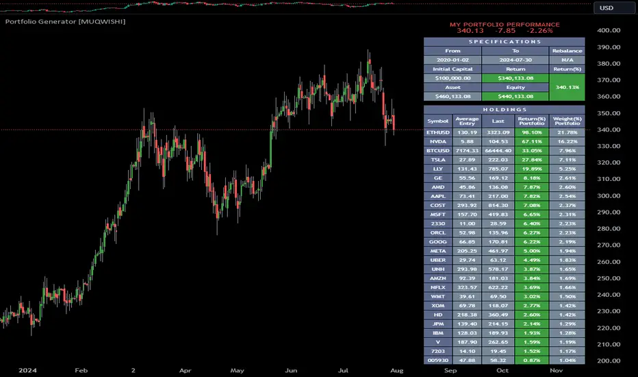 3. Portfolio Holdings, a list of the holding securities inside a table that contains the ticker, average entry price, last price, return percentage of the portfolio's initial capital, and customized weighted percentage of the portfolio. Additionally, a tooltip appears when the user passes the cursor over a ticker's cell, showing brief information about the company, such as the company's name, exchange market, country, sector, and industry.