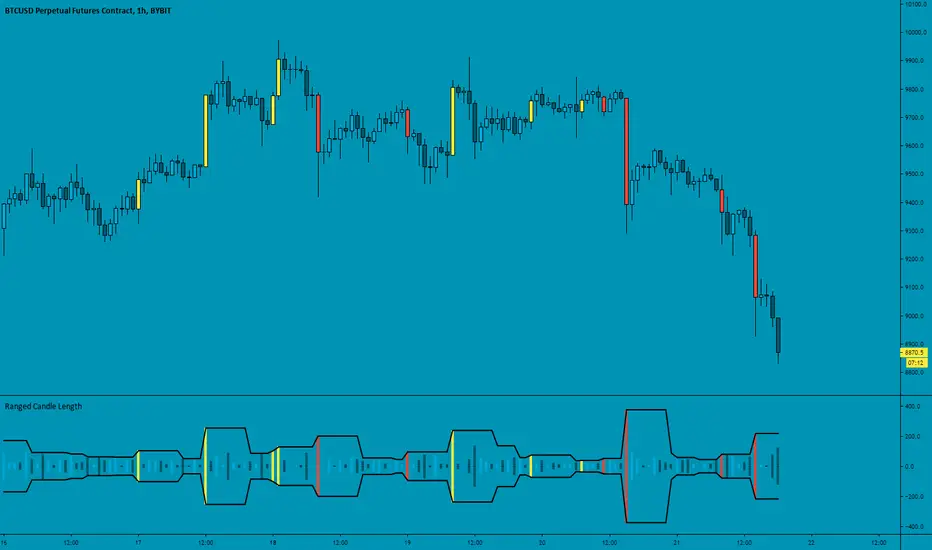Similar to one of my previous scripts 'Ranged Volume', but instead of using volume, this script uses candle length mirrored. It creates a range using highest and lowest of a given period. When the range gets larger, it means the current candle is bigger than the largest candle of your given period (break-out).