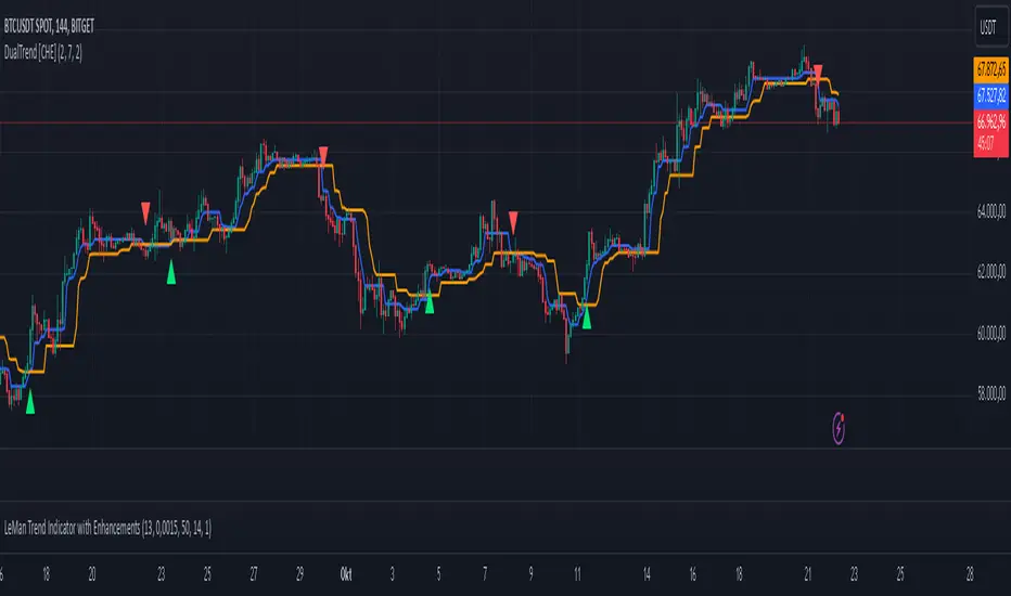 Elevate your trading strategy with the DualTrend [CHE] indicator. Leveraging the proven methodology of the HalfTrend Indicator by everget, this tool offers dual trend analysis, customizable settings, and clear visual signals to help you navigate the markets with precision. Whether you're aiming to capture short-term movements or identify long-term trends, DualTrend [CHE] is your reliable companion on TradingView.