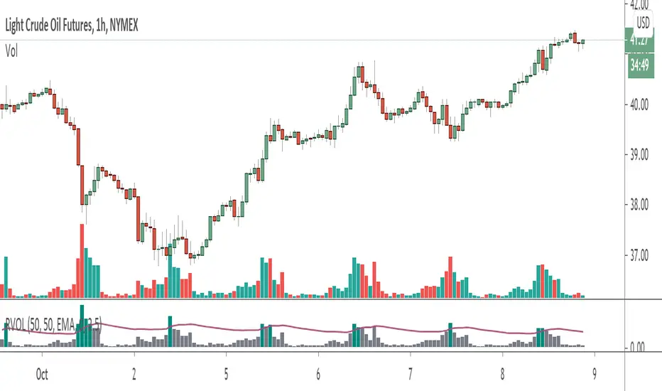 RVOL is calculated as: Volume divided by Moving Average value. You can change the moving average period (and type) in the settings.