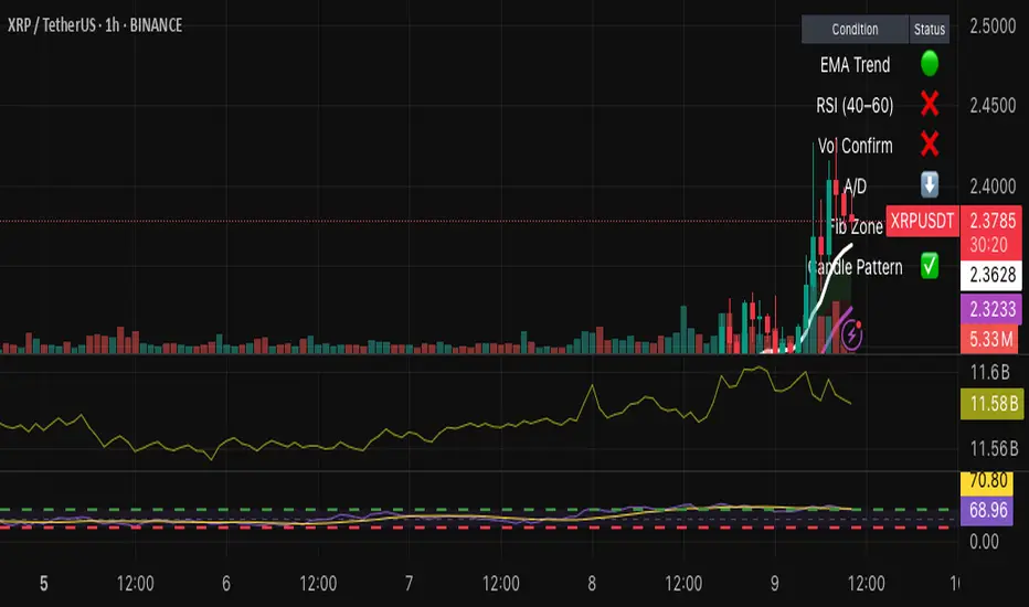 This indicator is a complete trading assistant designed for crypto swing and day traders, built to identify high-probability long and short setups based on a multi-confirmation system.