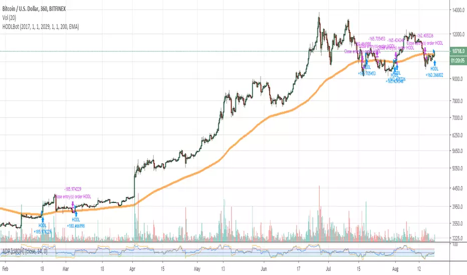 HODLBot is a very simple script that HODLs BTC when price > 200 EMA on 6hr timeframe, and sells (closes long) when price < 200 EMA.