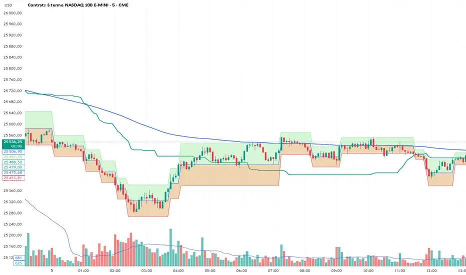 The Mogalef Bands indicator projects future price ranges by combining linear regression and standard deviation calculations. It dynamically updates bands only on significant breakout movements, providing potential support/resistance levels and trend direction.