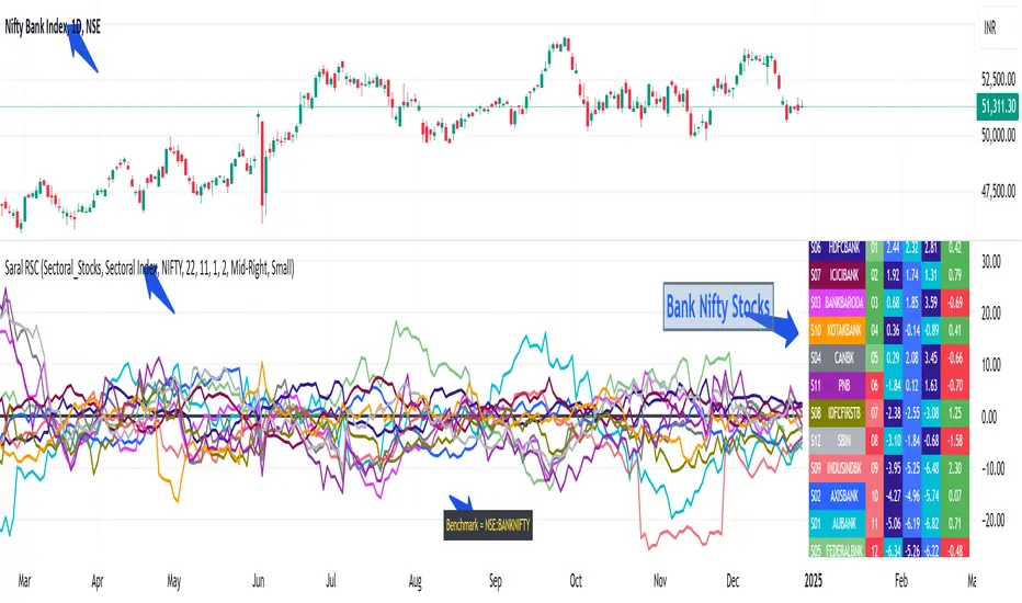 The Saral Relative Strength Comparison (Saral RSC) indicator has been revamped to provide enhanced functionality for comparing the performance of stocks or sectors relative to a benchmark index. With advanced customization options, users can now analyze sectoral stocks or a custom stock list while benchmarking against either a sectoral index or a custom benchmark. This tool enables identification of outperforming and underperforming stocks/sectors, providing actionable insights for trading strategies.