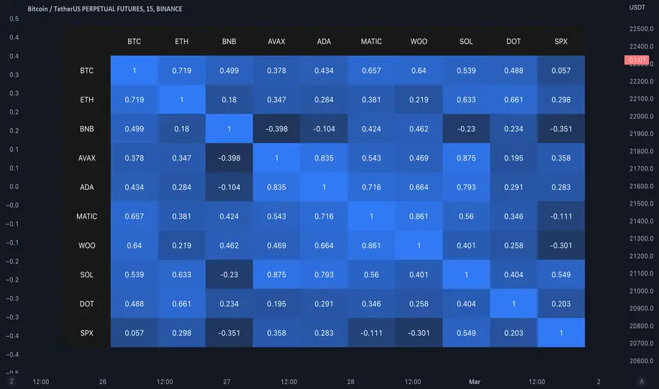 The indicator displays correlation coefficients for each pair of 10 assets in a matrix format, where the rows and columns represent the assets being compared between each other. The color of each cell corresponds with the strength of the correlation coefficient, allowing you to quickly identify which assets are strongly correlated, and which are not, and use that information to adjust risk or even get trade ideas. Coupled with the "Price Change" function, the script will help you find trade opportunities based on eg. the long-term correlation strength and short-term price direction differences between two assets. The "Correlation Length" input defines the number of bars used for calculating the correlation, while "Price Change Length" defines the bar to which the current price is compared when calculating price change (eg. the input 20 means that the script will compare the price of the candle close that occurred 20 bars ago and the current price).