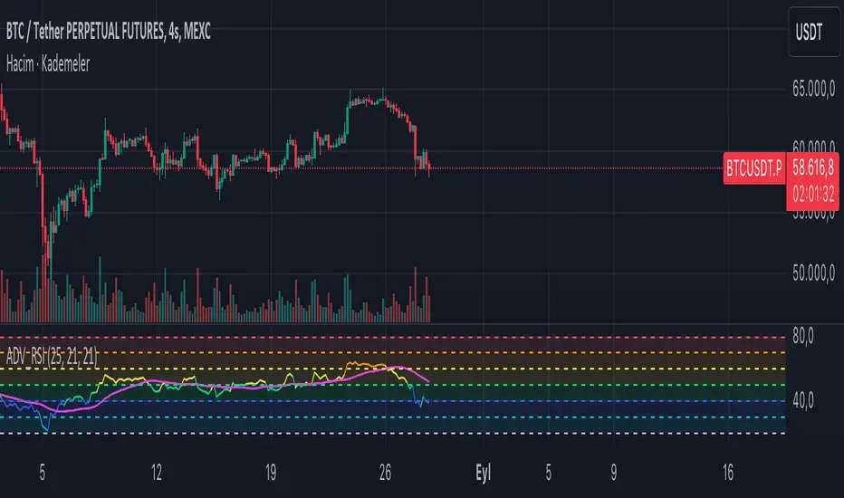 Description: The ADV_RSI indicator is an advanced and mutated version of the classic Relative Strength Index (RSI), enhanced with multiple moving averages and a dynamic color-coding system. It provides traders with deeper insights into market momentum and potential trend reversals by incorporating two different moving averages of the RSI (21, and 50 periods). The indicator helps to visualize overbought and oversold conditions more effectively and offers a clear, color-coded representation of the RSI value relative to key thresholds.