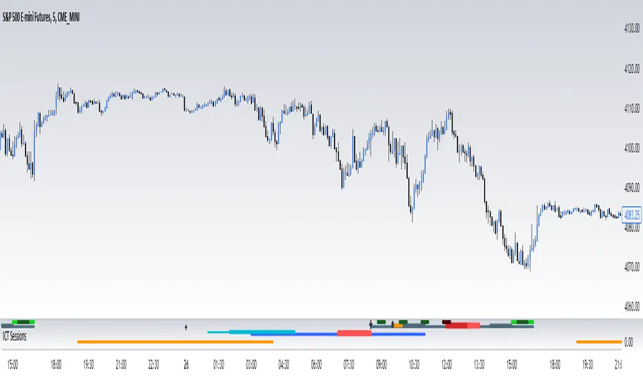 This script plots the timewindows of the ICT killzones (for forex) and trading session + makros below the chart. Individual components can be switched of to your liking