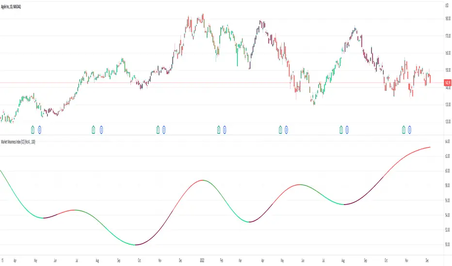 A rising Market Meanness Index means that the market is becoming more volatile and that there is a high likelihood of a change in the underlying trend. A falling Market Meanness Index means that the current trend is dying and there is a high likelihood of a trend reversal. Typically I put general buy and sell signals in red or green but in this particular case, this indicator works best as a overall trend filter and you would want to place a trade when this indicator has a peak or valley. Let me know if you find a good overall buy and sell signal system of course.
