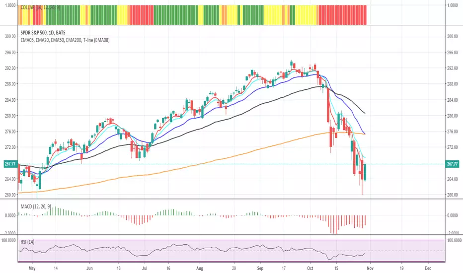 The Collar signal ribbon uses 4 different color signals to help you deciding what to do with your position. It uses a combination of MACD , RSI , EMA5 and EMA20 indicators to predict possible changes stock movement.