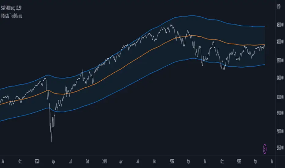The "Ultimate Trend Channel" indicator is a comprehensive trend analysis tool that calculates and displays a series of upper and lower bands based on user-defined input lengths. It uses linear regression and standard deviation to determine these bands for each of the 21 different group lengths. The indicator then computes the averages of these upper and lower bands, as well as the average of all the bands combined.
