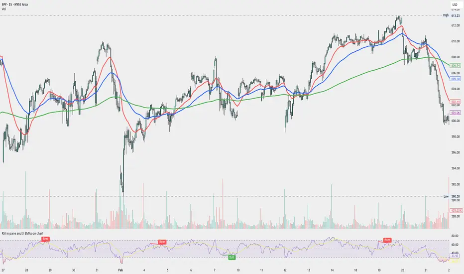 Atualizado RSI in pane and 3 EMAs on chart