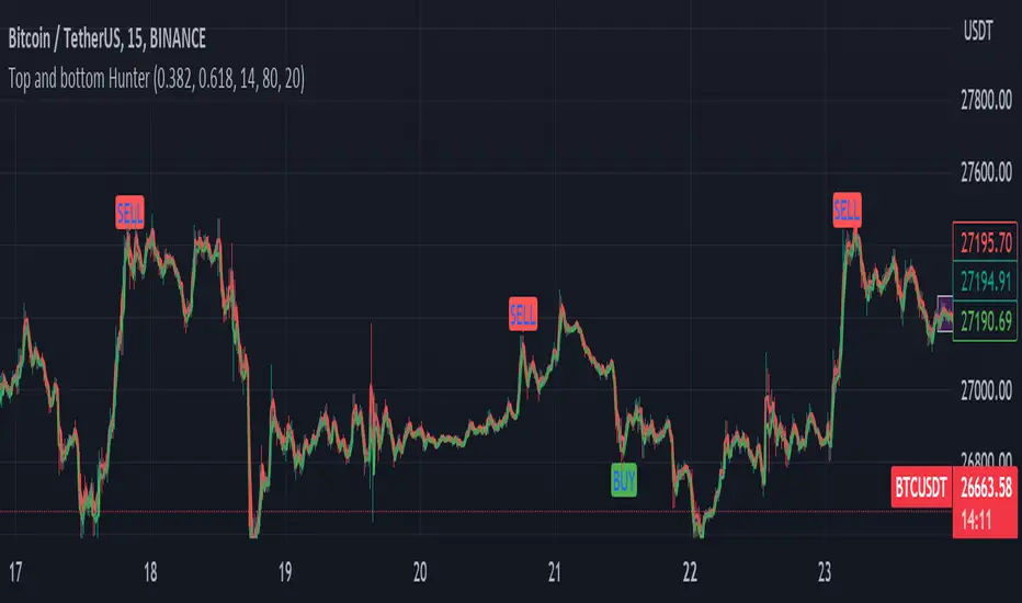 "Top and bottom Hunter" indicator combines two popular technical analysis tools, Fibonacci retracement levels and the Relative Strength Index (RSI), to identify potential trading opportunities in the market.