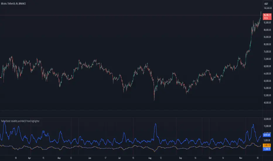 🔸Trend Analysis with MACD: The MACD line and signal line are plotted and adjusted with a user-defined multiplier to visualize trends alongside the volatility signals.