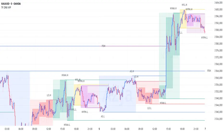 “TF ZONES VIP” is a comprehensive TradingView indicator designed for professional traders, providing clear visualization of key session zones, pivot levels, High/Low levels, and intraday mini-cycles. It offers full control over multi-timeframe analysis.