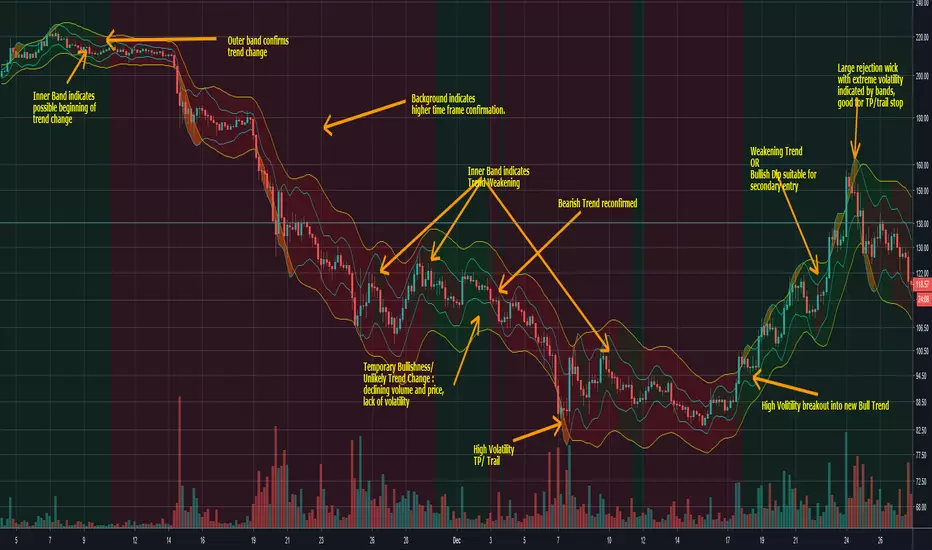 There's elements of pivot boss, multiple length volume weighted ALMA based trend detection (optional MTF) and my own "chandelier" based cycle/volatility bands.
