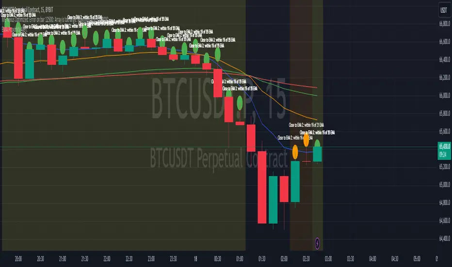 The indicator includes alert conditions that can be used to trigger notifications in TradingView. When the price is close to a monitored EMA, an alert is triggered with a message indicating which EMA is close.