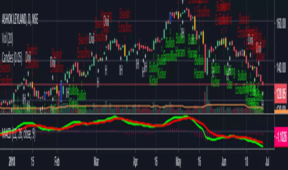 The default script has: Doji , Bearish Harami, Bullish Harami, Bearish Engulfing , Bullish Engulfing , Piercing Line, Bullish Belt, Bullish Kicker, and Bearish Kicker. The Piercing Line, Bullish Belt, and the Kickers will usually show up better in the daily charts .
