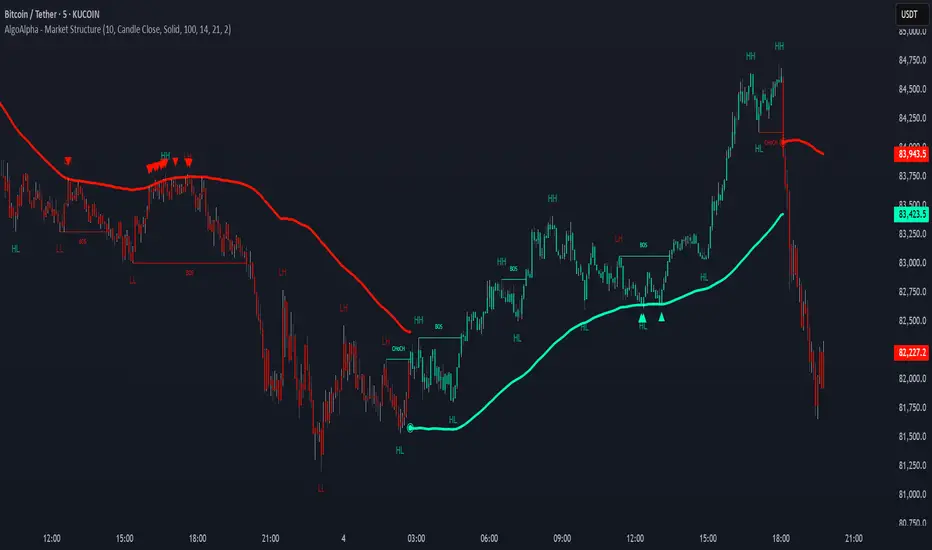 Market structure is the foundation of price action trading, focusing on the relationship between successive highs and lows to understand trend conditions. Break of Structure (BOS) and Change of Character (CHoCH) events are important because they signal when a market might be shifting direction. This script enhances traditional structure by integrating volatility bands, which act like dynamic support/resistance zones based on ATR, allowing it to capture momentum surges and rejections beyond just structural shifts.