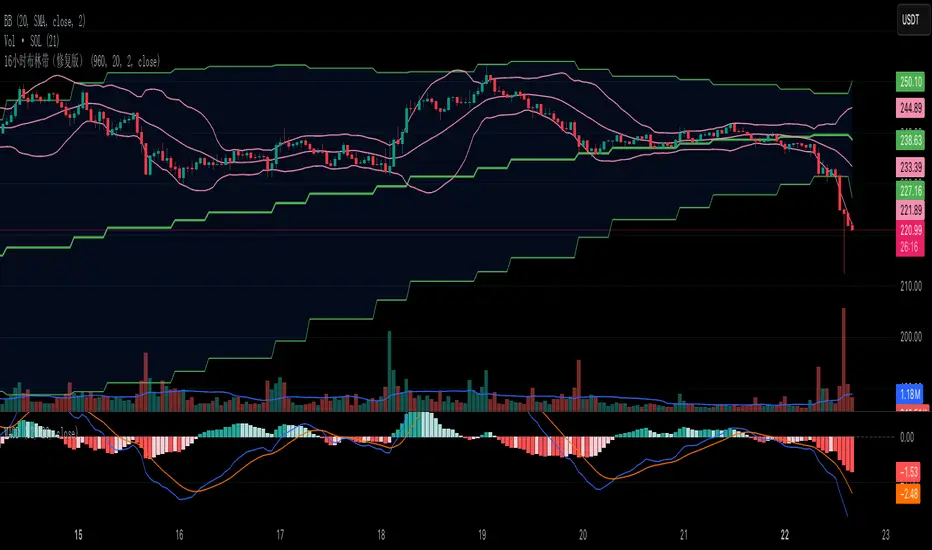 This indicator plots Bollinger Bands based on the 16-hour timeframe, regardless of the chart’s current timeframe.