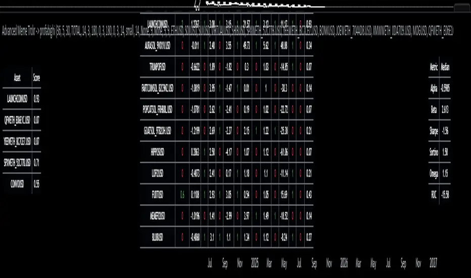 The Advanced Memecoin Tracker -> PROFABIGHI_CAPITAL is a specialized multi-chain memecoin intelligence dashboard that integrates relative strength positioning (RSP) via RSI on asset ratios with benchmark-relative metrics to score up to 36 memecoins across Ethereum, Solana, SUI, and BASE/VIRTUAL ecosystems. It computes weighted composites from outperformance binaries, category-leading RSP flags, and rank-based points, visualized in expansive tables for median benchmarking and top rankings to pinpoint viral momentum leaders amid speculative volatility.