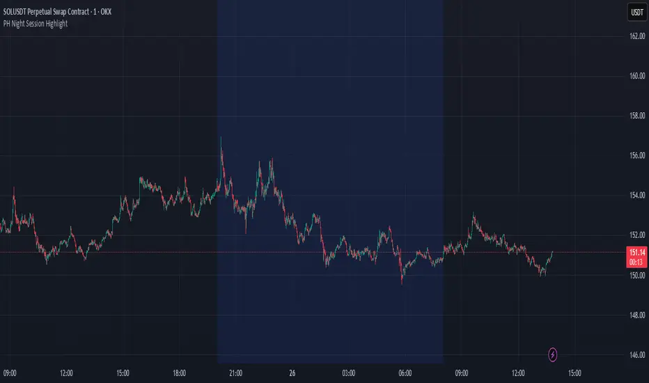 Traders who want to visually separate the night session on their charts. It highlights the period from 8:01 PM to 7:59 AM (Philippine Time), making it easy to distinguish off-hours or pre-market activity, especially when analyzing crypto or 24/7 markets.