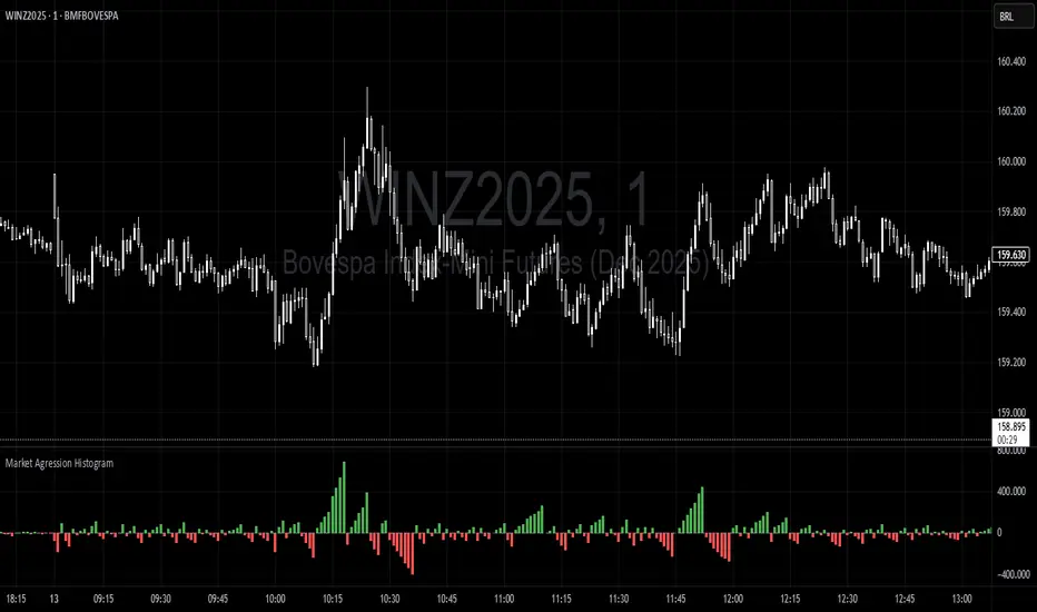 This indicator is a histogram that accumulates the net volume of aggressive buying and selling per candle, representing the dominant market pressure within defined time-frame.
