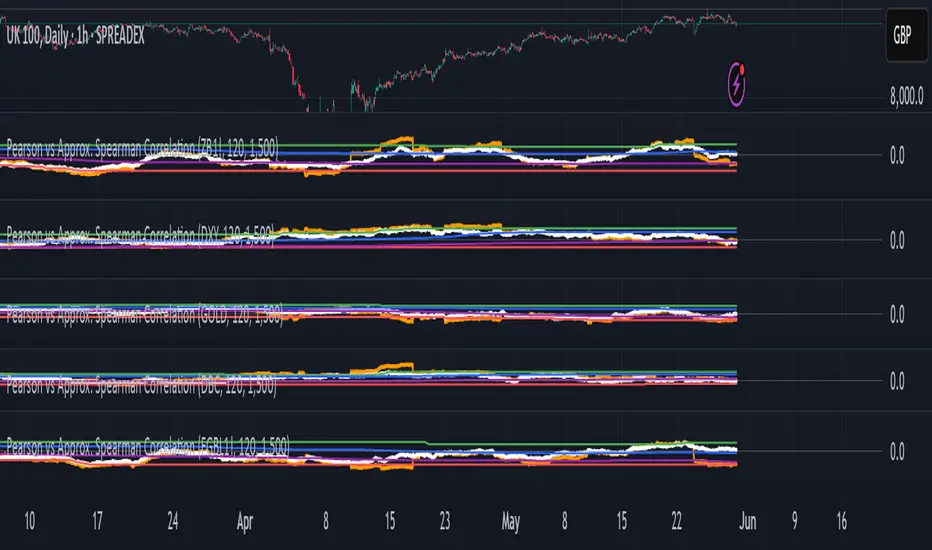 This indicator displays the rolling Pearson and approximate Spearman correlation between the chart's asset and a second user-defined asset, based on log returns over a customizable window.