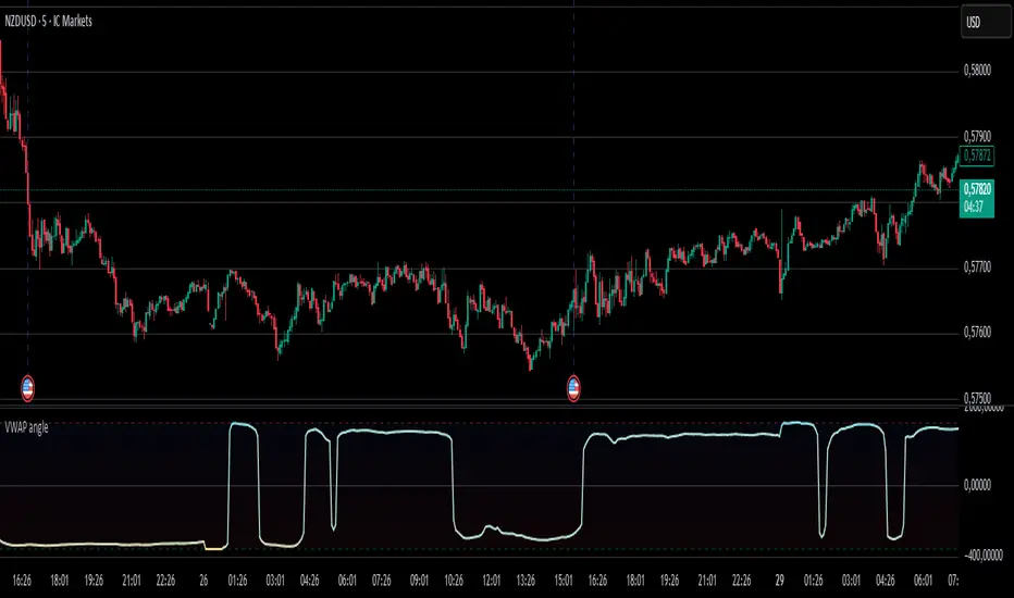 The VWAP Angle indicator is a technical analysis tool designed to measure the directional momentum of the Volume Weighted Average Price (VWAP). Rather than simply plotting the VWAP line itself, this indicator calculates the angle of the VWAP's trajectory over a specified lookback period. It converts the slope into degrees using arctangent mathematics, normalized by the Average True Range (ATR) to account for price volatility. The result is a momentum oscillator that ranges from -100 to +100, providing traders with a clear visual representation of whether the VWAP is trending sharply upward, downward, or moving sideways.