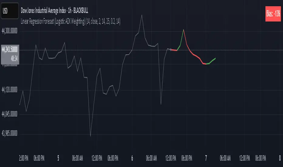 This indicator is a dynamic price projection tool that combines multiple linear regression forecasts into a single, adaptive forecast curve. By integrating trend strength via the ADX and directional bias, it aims to visualize how price might evolve in different market environments—from strong trends to mean-reverting conditions.