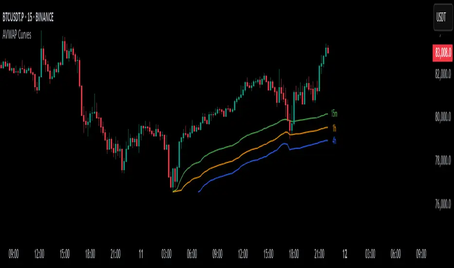 Multiple Timeframes: Displays AVWAP curves for 15m, 1h, and 4h. Users can toggle visibility for each timeframe.