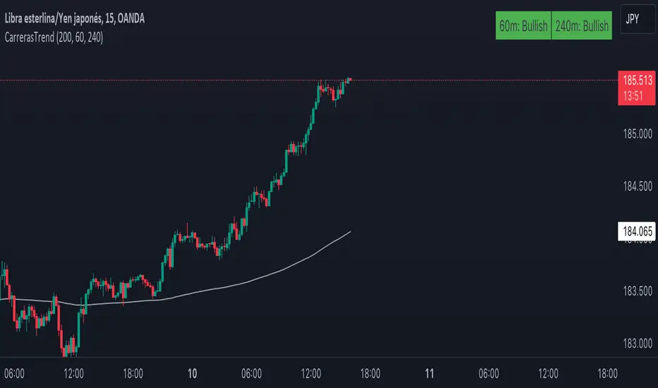 Este indicador, creado por Maximiliano Carreras, muestra la tendencia basada en la EMA de 200 periodos (Modificable) en el gráfico. La EMA es calculada en función de los datos del gráfico de 1 y 4 horas (Modificables ambos tiempos). El indicador etiqueta la tendencia como "Bullish" (alcista) si el precio de cierre está por encima de la EMA y como "Bearish" (bajista) si está por debajo. El indicador se muestra en la esquina superior derecha del gráfico, proporcionando información sobre la tendencia general del activo subyacente.