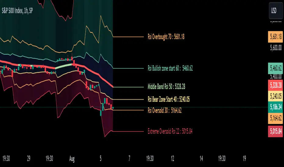 With the RSI Levels On Chart users are able to see on chart the price that a candles need to close for a certain value of the RSI. E.g. what price is needed for the RSI to be at oversold 30 or what would be the price when rsi will cross the 50 line.