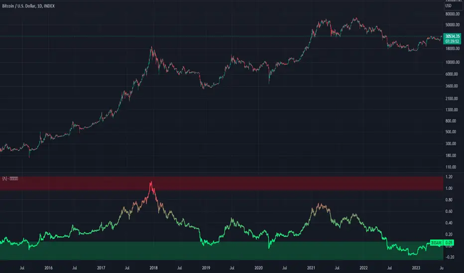 BEAM (Bitcoin Economics Adaptive Multiple) is an indicator that assesses the valuation of Bitcoin by dividing the current price of Bitcoin by a moving average of past prices. Its purpose is to provide insights into whether Bitcoin is under or overvalued at any given time. The thresholds for the buy and sell zones in BEAM are adjustable, allowing users to customize the indicator based on their preferences and trading strategies.