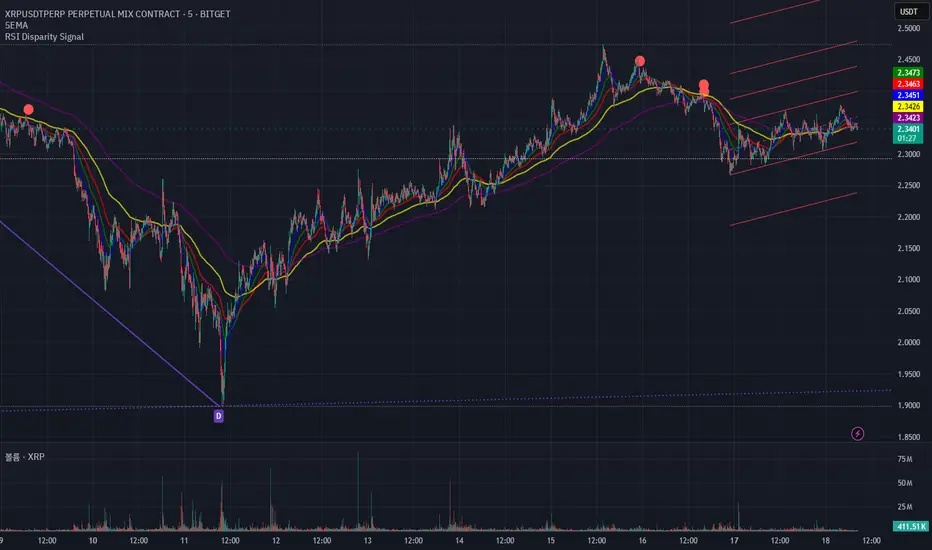 This TradingView indicator detects when the RSI is significantly lower than its RSI-based moving average (RSI MA). Whenever the RSI is 20 points or more below the RSI MA, a signal (red dot) appears above the corresponding candlestick.