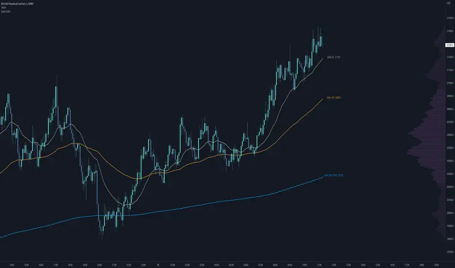 This script lets you add up to 8 EMAs (Exponential Moving Averages) that can be set to any timeframe and length. The difference between this and other EMA indicators is that it has a simple label attached to each EMA showing which timeframe it belongs to and what length it is, so you can get that information at a glance while trading without having to remember the specific settings for each EMA.
