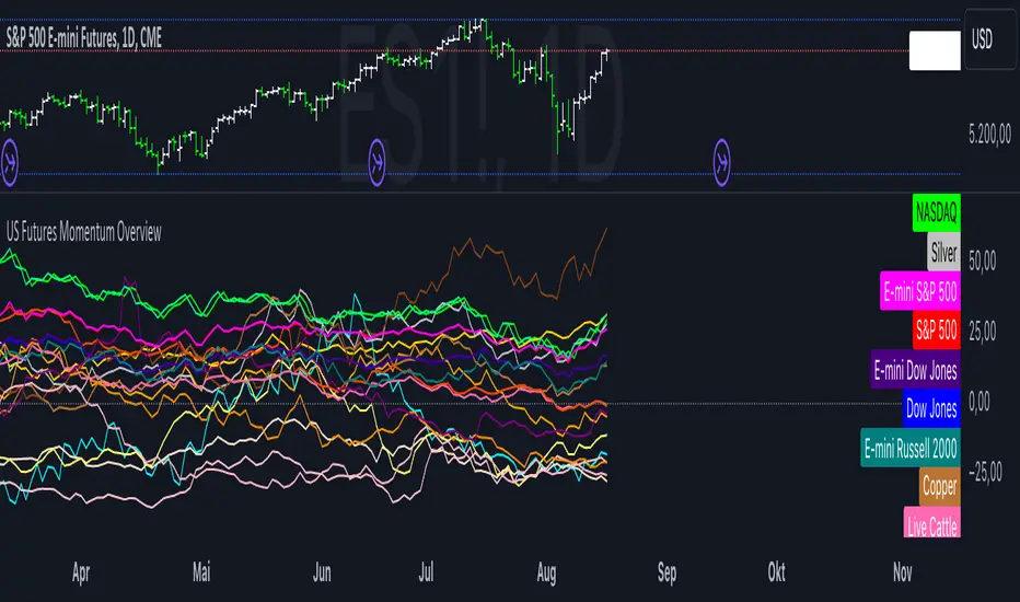 The "US Futures Momentum Overview" indicator is designed to provide a comprehensive view of momentum across various U.S. futures markets. It calculates the Rate of Change (ROC) for multiple futures contracts and displays them as lines on a chart. Each futures market is plotted with a unique color for easy differentiation, allowing traders to quickly assess the momentum in different markets.