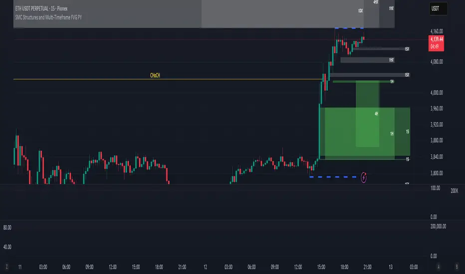 SMC Structures and Multi-Timeframe FVG IndicatorTip: For optimal performance, adjust the number of FVGs displayed per timeframe in the settings. On high-performance devices, up to 8 FVGs per timeframe can be used without issues. If you experience slowdowns, reduce to 3 or 4 FVGs per timeframe. If the chart flashes, disable indicators one by one to identify conflicts, or try using the TradingView Mobile or Windows App for a smoother experience.