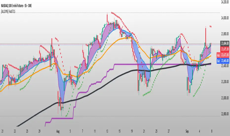 The **FxASTLite [ALLDYN]** script offers traders several key benefits:1. **Integrated EMA and PSAR Systems**: This script leverages Exponential Moving Averages (EMAs) and the Parabolic Stop and Reverse (PSAR) to help traders identify potential trends and trend reversals. With color-coded EMAs and a PSAR flip detection, traders can quickly identify optimal entry and exit points.