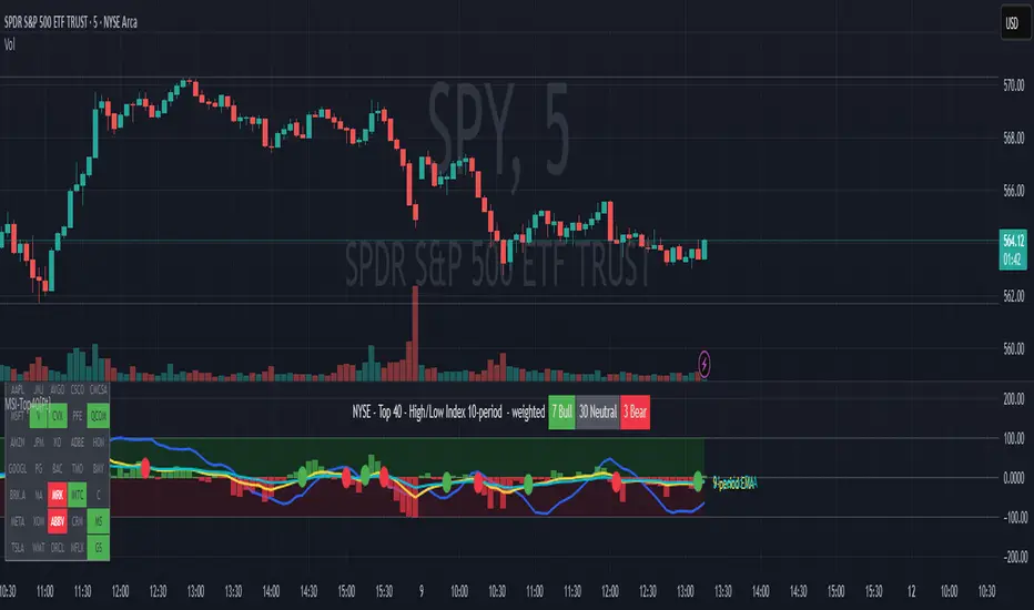 Market Sentiment Index US Top 40 [Pt} shows how the largest US stocks behave together. You pick one simple measure—High Low breakouts, Above Below moving average, or RSI overbought/oversold—and see how many of your chosen top 10/20/30/40 NYSE or NASDAQ names are bullish, neutral, or bearish.