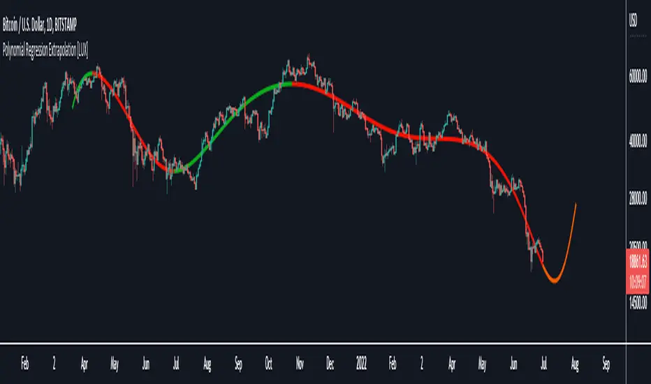 This indicator fits a polynomial with a user set degree to the price using least squares and then extrapolates the result.