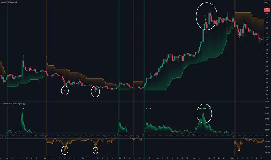 Commodity Trend Reactor [BigBeluga] extends the traditional Commodity Channel Index (CCI) by integrating trend-trailing logic and reactive reversal markers. It visualizes trend direction using a trailing stop system and highlights potential exhaustion zones when CCI exceeds extreme thresholds. This dual-level system makes it ideal for both trend confirmation and mean-reversion alerts.