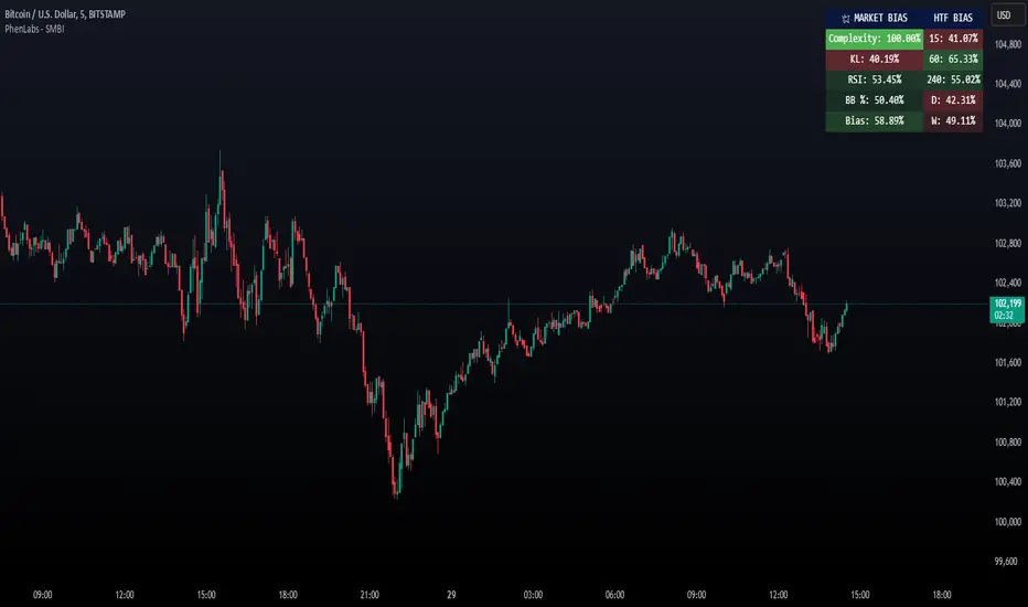 The Smart Market Bias Indicator (SMBI) is an advanced technical analysis tool that combines multiple statistical approaches to determine market direction and strength. It utilizes complexity analysis, information theory (Kullback Leibler divergence), and traditional technical indicators to provide a comprehensive market bias assessment. The indicator features adaptive parameters based on timeframe and trading style, with real-time visualization through a sophisticated dashboard.
