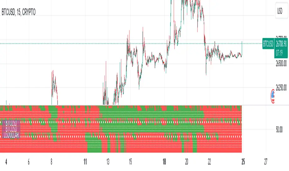 This indicator works to calculate the exponential moving average (EMA) of three symbols. The first is the symbol shown on the chart in front of you, the second is for Bitcoin (it can be changed), and the third is the dollar strength index (DXY), which can be changed.