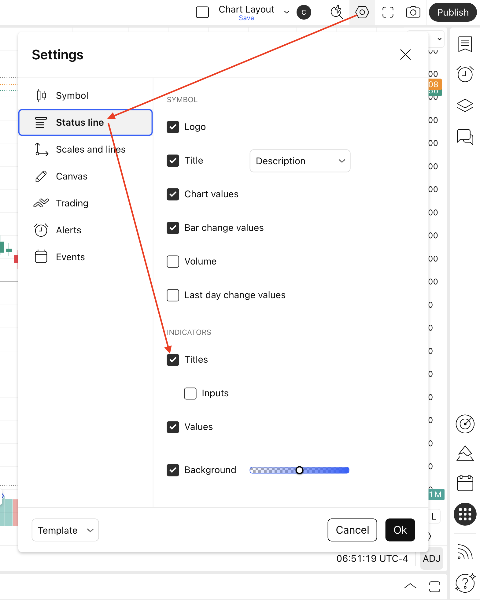 Você pode ajustar as configurações de qualquer indicador clicando no botão Configurações ao lado do título do indicador específico.