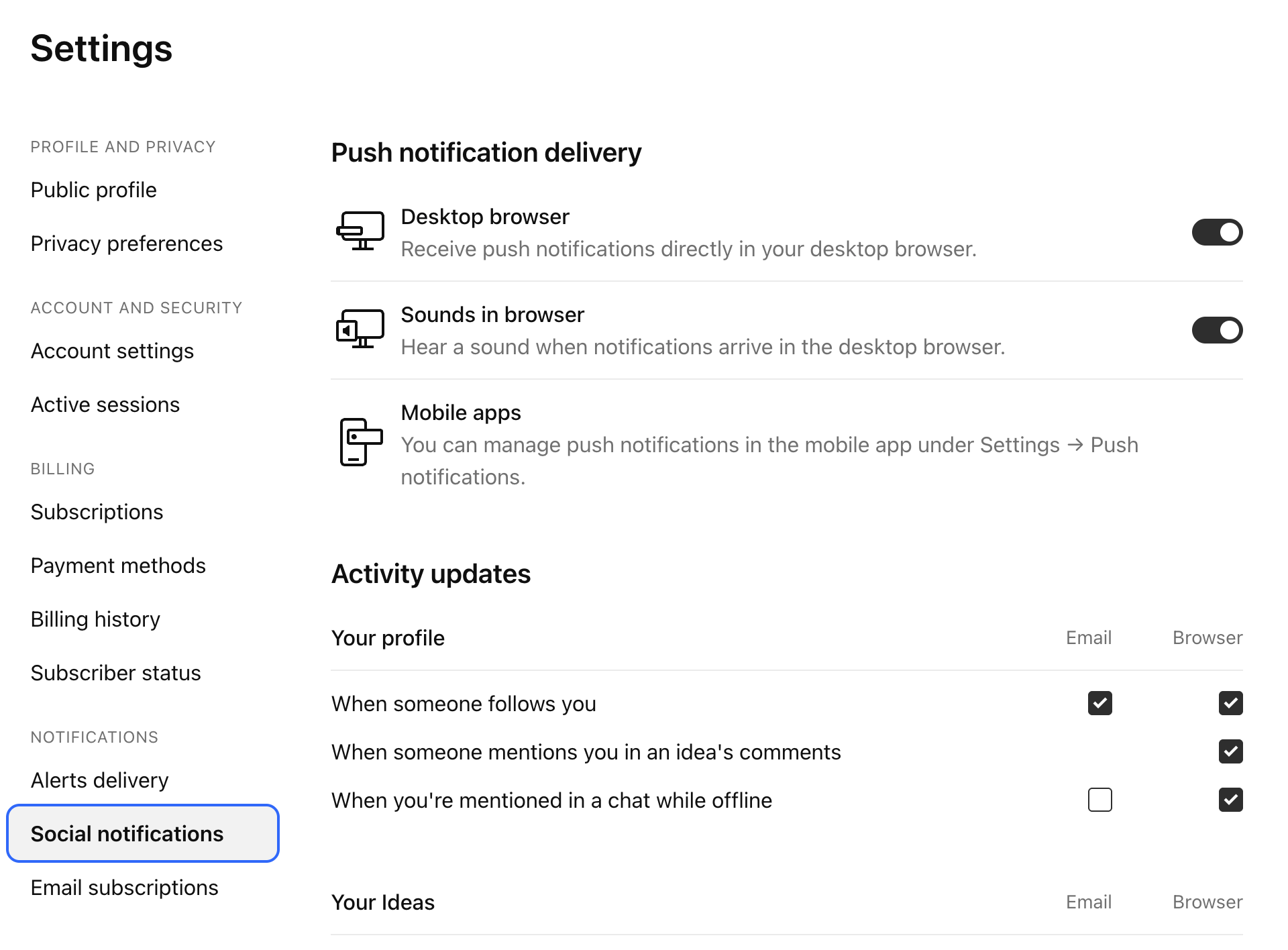 Você pode ajustar as notificações em suas configurações de perfil → na aba de notificações de Redes Sociais.