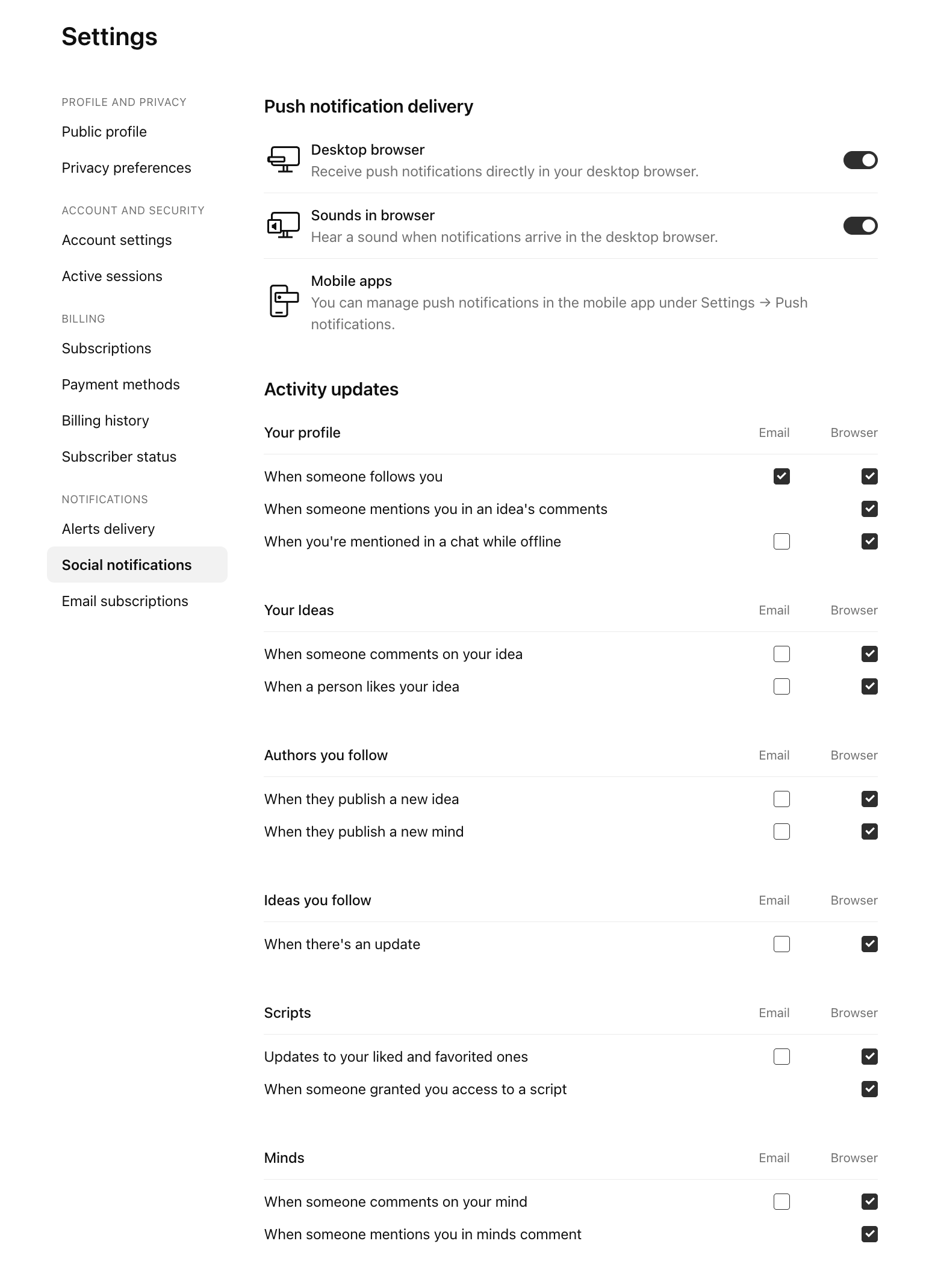 - notificações sobre novas idéias sobre símbolos que você segue estão disponíveis apenas no site. Notificações por email foram descontinuadas