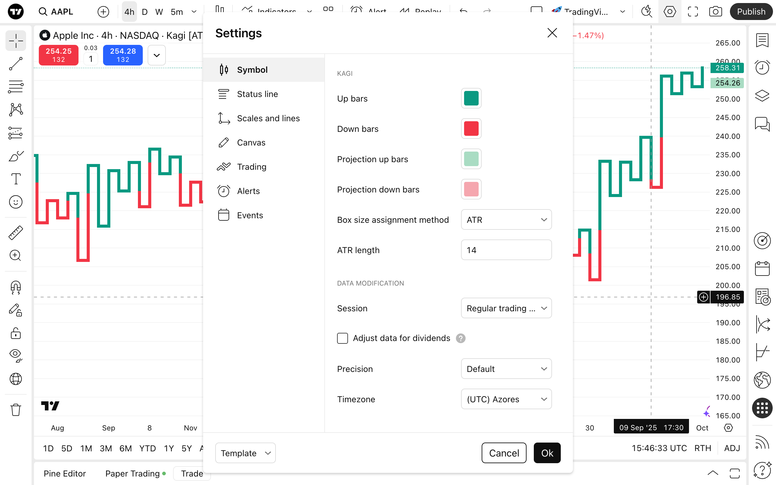 - Configurações dos gráficos Kagi