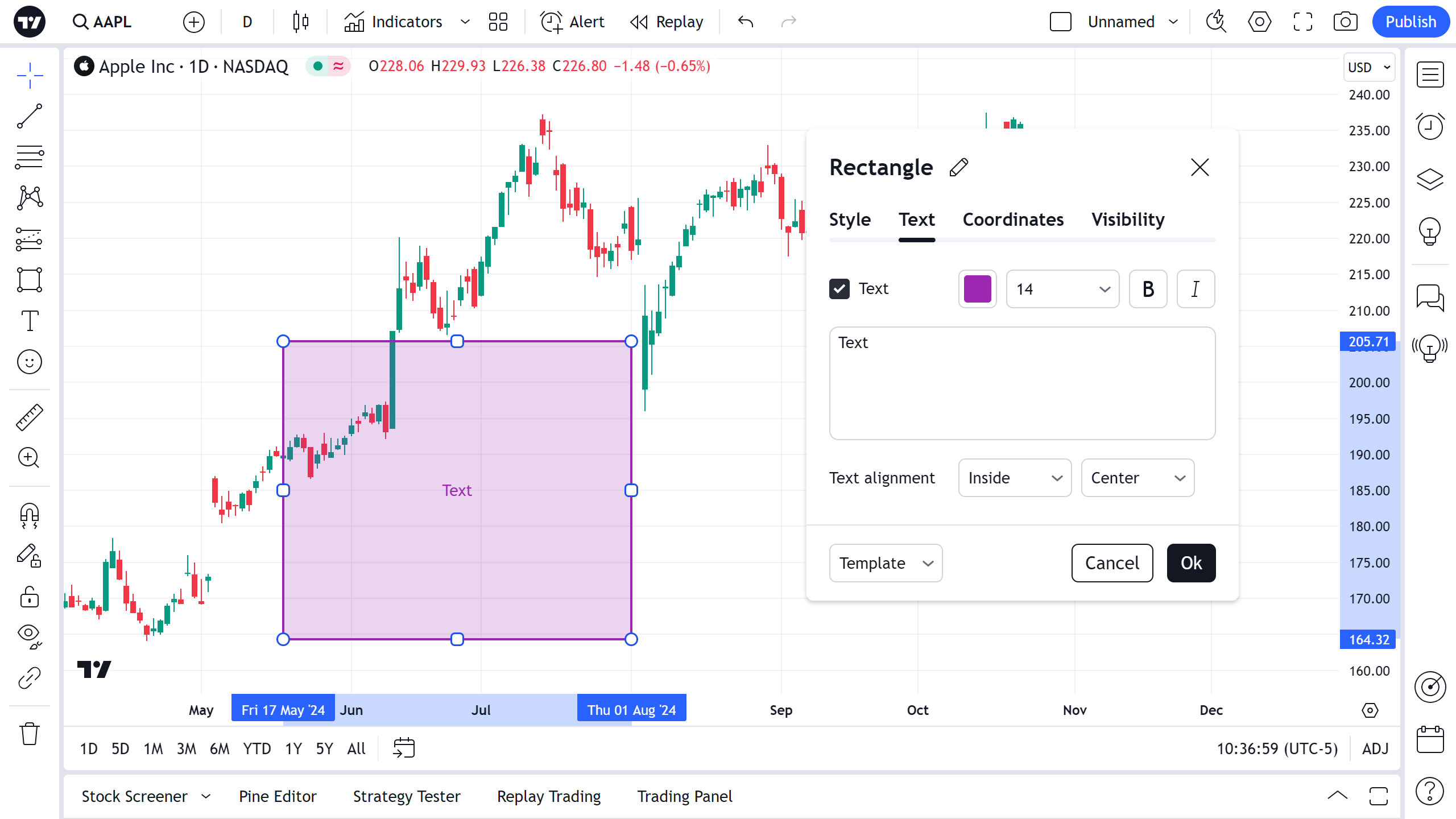 Você também pode editar o texto de um retângulo diretamente no gráfico – basta clicar no campo de texto no centro do desenho e começar a digitar.